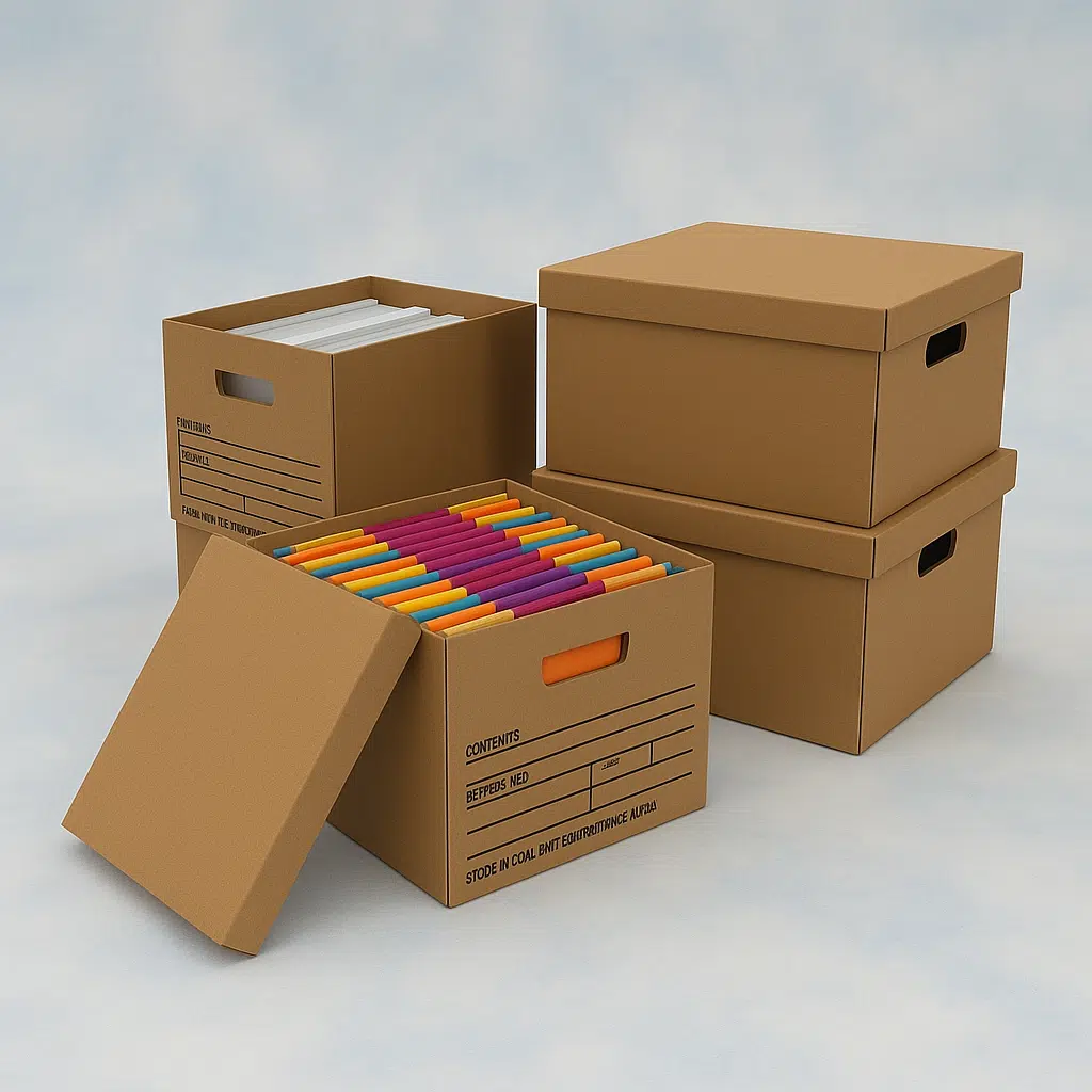 Strong organizational boxes made to safely store and transport documents.